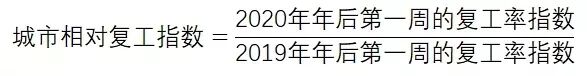 可以看到,绝大多数样本城市的线下复工率指数低于全国平均水平;一线城市中,北上广不足40%,深圳更是只有20%出头。当然,城市间的复工率指数差异除了受疫情程度不同影响外,城市间产业结构、外来劳动力依赖度等因素都会对复工率产生影响(比如建筑业复工期远远晚于服务业,那么建筑业占比高的城市自然复工率就比服务业占比高的城市低)。为了排除这一因素,我们再用每个城市的今年和去年做同期复工率比较,因此就有以下这个公式: