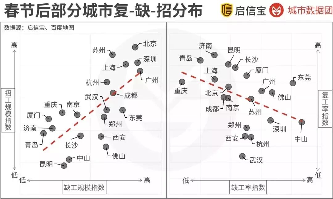 - 右上角:缺工率高、招工率也高;包括以广州、杭州、深圳为代表的一线与准一线城市,它们面临的缺工困难较大,但恢复的意愿和信心也都非常强。
