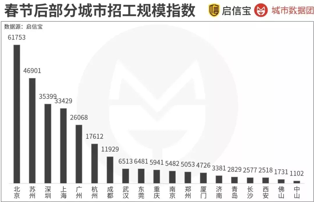 北上的颜色“暗淡”了,排名“落后”了,这说明它们缺口虽大,家底也厚,缺工率指数并不是很高;而珠三角以制造业为特色的中山、东莞、佛山等城市成为了缺工率指数最高的城市。相应地,省会城市的缺工率指数往往远高于其他省内城市。当然,随着疫情进一步得到缓解和控制,后续国内的劳动力流动性会进一步加强,各个城市的缺工率也会进一步下降。这一点我们很有信心。面对较低的复工率和巨大的劳动力缺口,大部分城市其实在复工后第一时间就挂出了大量的招聘信息。我们从启信宝提供的60万条抽样招聘信息中提取出20个样本城市的年后招工规模指数,可以从这个角度来观察以上问题: