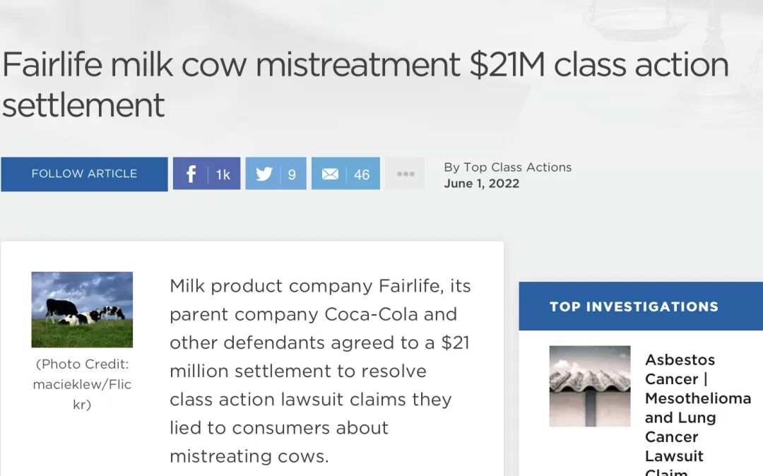 然而就在几个月前,这家公司被告了!现在,Fairlife、Fair Oak Farms以及其母公司可口可乐公司等,同意用2100万美元进行和解,而且人!人!有!份!