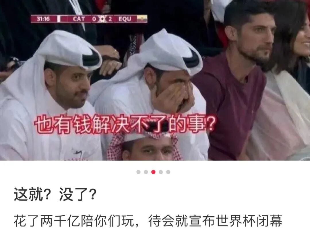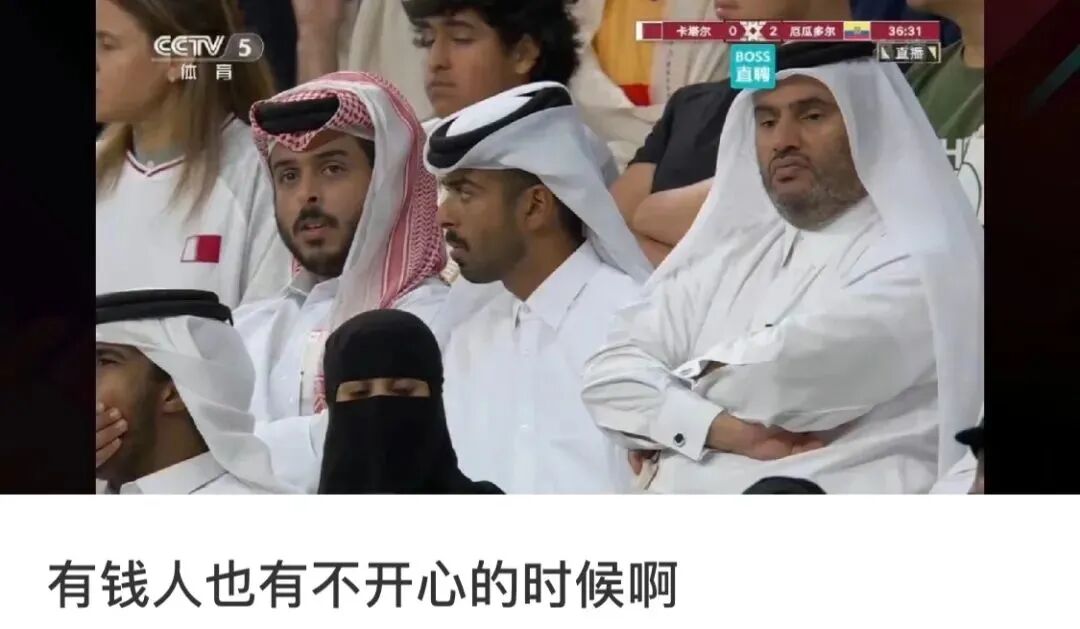 在看到厄瓜多尔进球后,观众席上的卡塔尔土豪们用戴满十个宝石戒指的双手痛苦地捂住了脸。