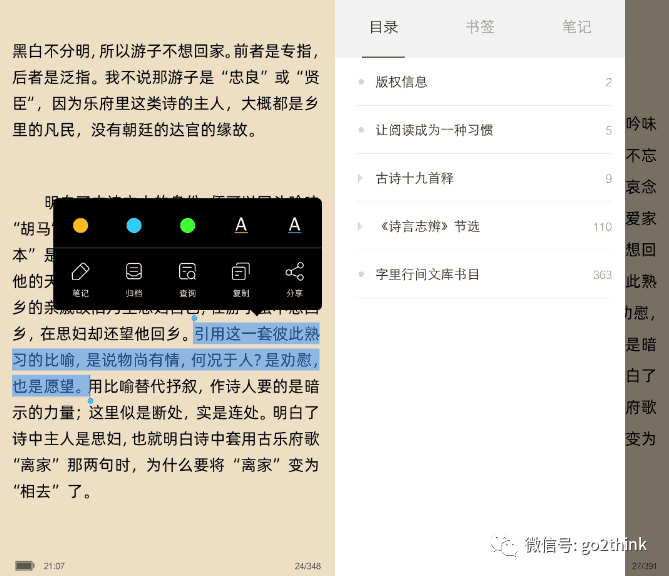 看到喜欢的句子,长按唤出笔记工具,可以进行标注、翻译或分享等。