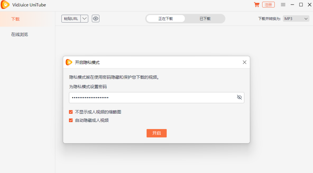 开启隐私模式并输入密码,然后下载的视频便会以隐私文件保存。