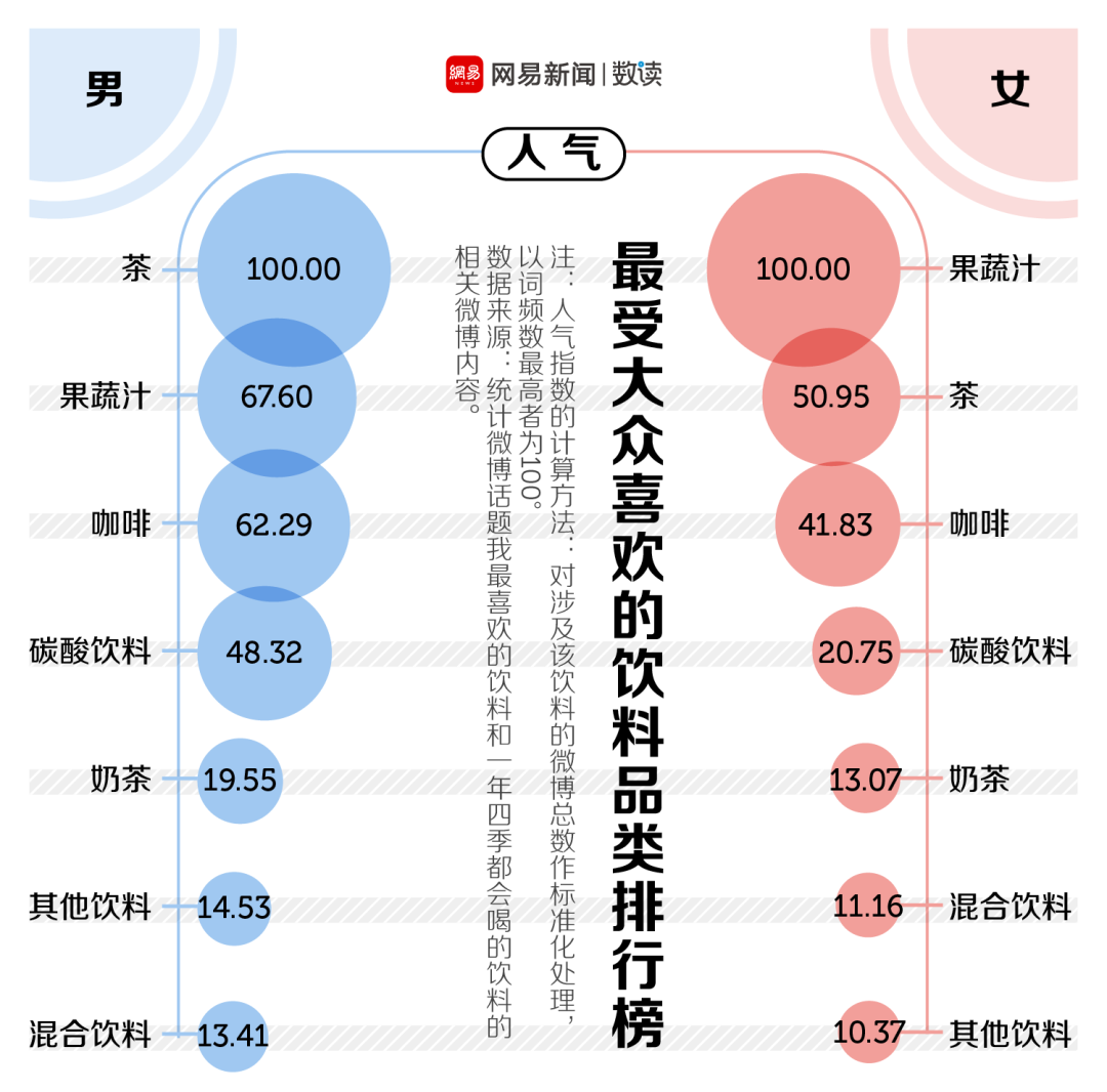 数读菌统计了微博“我最喜欢的饮料”等相关话题,发现整体上,茶饮、果蔬汁饮料和咖啡博取了最多消费者的欢心。
