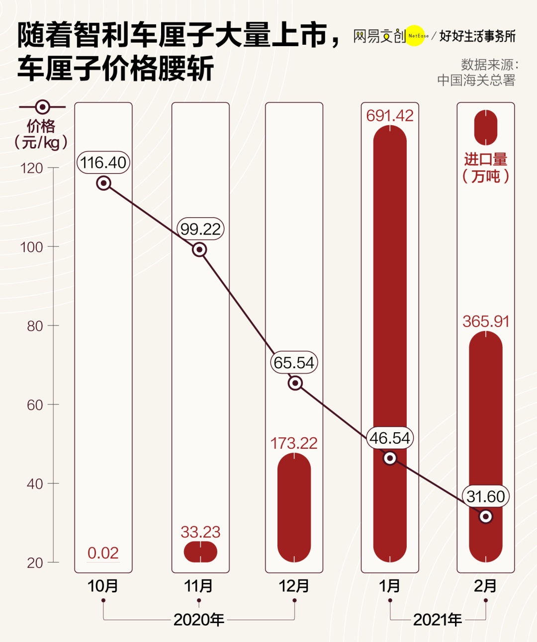 就拿中国市场最常见的智利进口车厘子来说,2020年10月,第一茬进入中国的早熟车厘子,价格高昂,平均116.4元/kg。但随着智利车厘子大量涌进中国,价格一路狂跌。到今年2月时,智利车厘子一公斤进口价已经降到31.6块钱[14]。