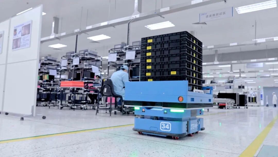这里是中兴通讯全球5G智能制造基地。在5G专网覆盖下,工厂内蓝色的AGV小车能自动识别周围障碍,将5G设备物料安全运至目标地点,作业准确率高达99.9%。
