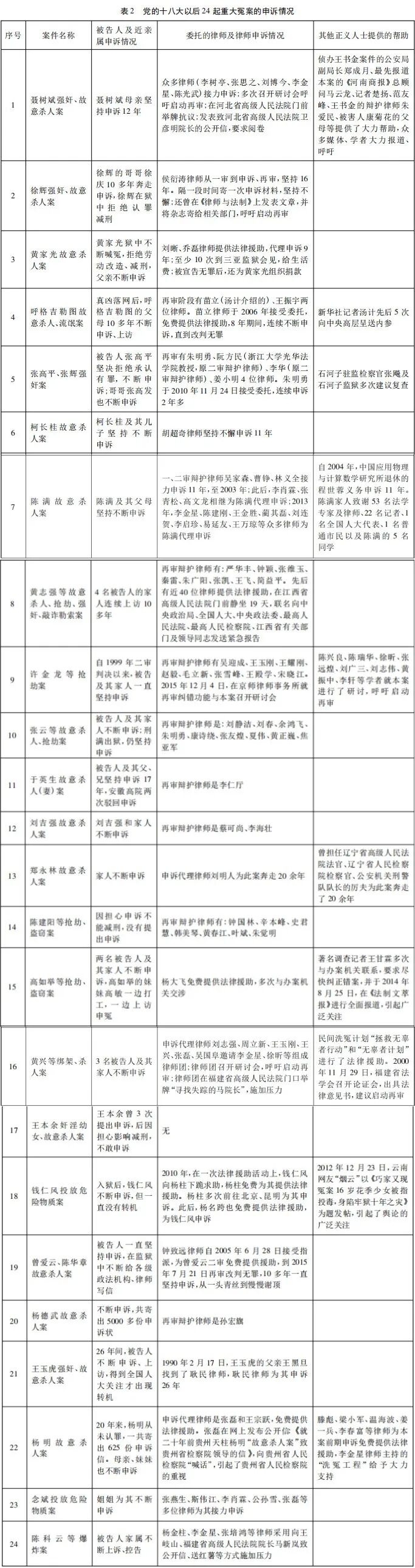 本来,当事人及其近亲属申诉是启动再审程序的重要方式,按照我国《刑事诉讼法》第242条的规定,在申诉符合法定条件时,法院必须启动再审程序,但在我国实践中,当事人及其近亲属申诉很难启动再审程序。就本文研究的24起重大冤案来看,除被告人及其近亲属申诉外,往往还必须有其他强有力的外力配合,如真凶出现、律师的大力抗争、媒体的广泛报道、其他正义人士的无私帮助,等等,才可能推动检察机关、法院启动再审程序(见下表2)。