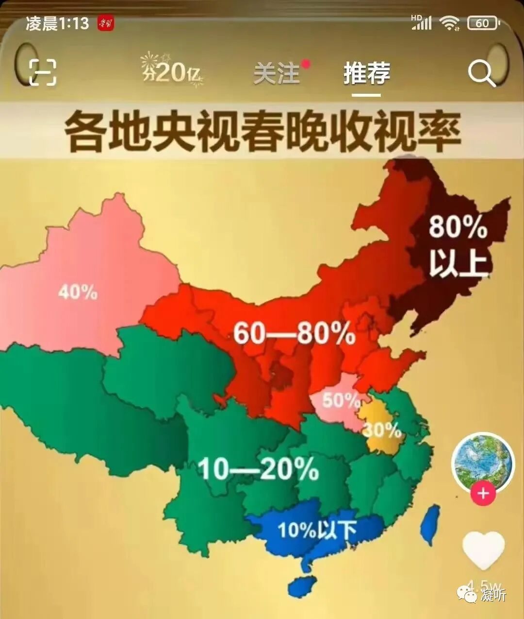 春晚刚刚结束,全国各地春晚收视率数据就出来了,东北三省收视率最高80%以上,京、津、内蒙、陕、甘、宁、晋、冀、鲁收视率在60-80%,河南收视率为50%、新疆40%、安徽30%,青、藏、川、渝、云、黔、鄂、湘、苏、沪、贵、闽在10-20%,广东、广西、海南、台湾均在10%以下。