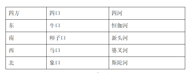 通过《长阿含经》与《俱舍论》系统的对比,可以看出四方所流出的四河是一致的,但是信度河和悉多河所流出的出口之名有出入。然而,“四方”、“四口”、“四河”与今天西藏阿里著名的四条河流[39]也并不完全吻合。