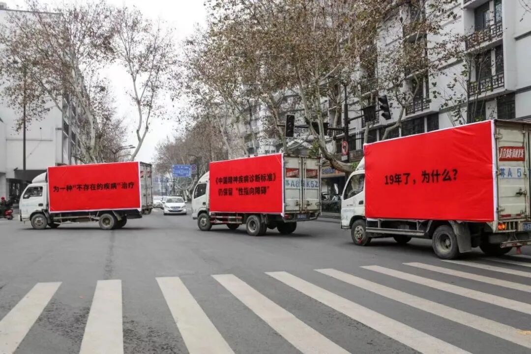 标语内容分别是:“为一种不存在的疾病治疗”、“《中国精神疾病诊断标准》仍保留性指向障碍”、“19年了,为什么?”