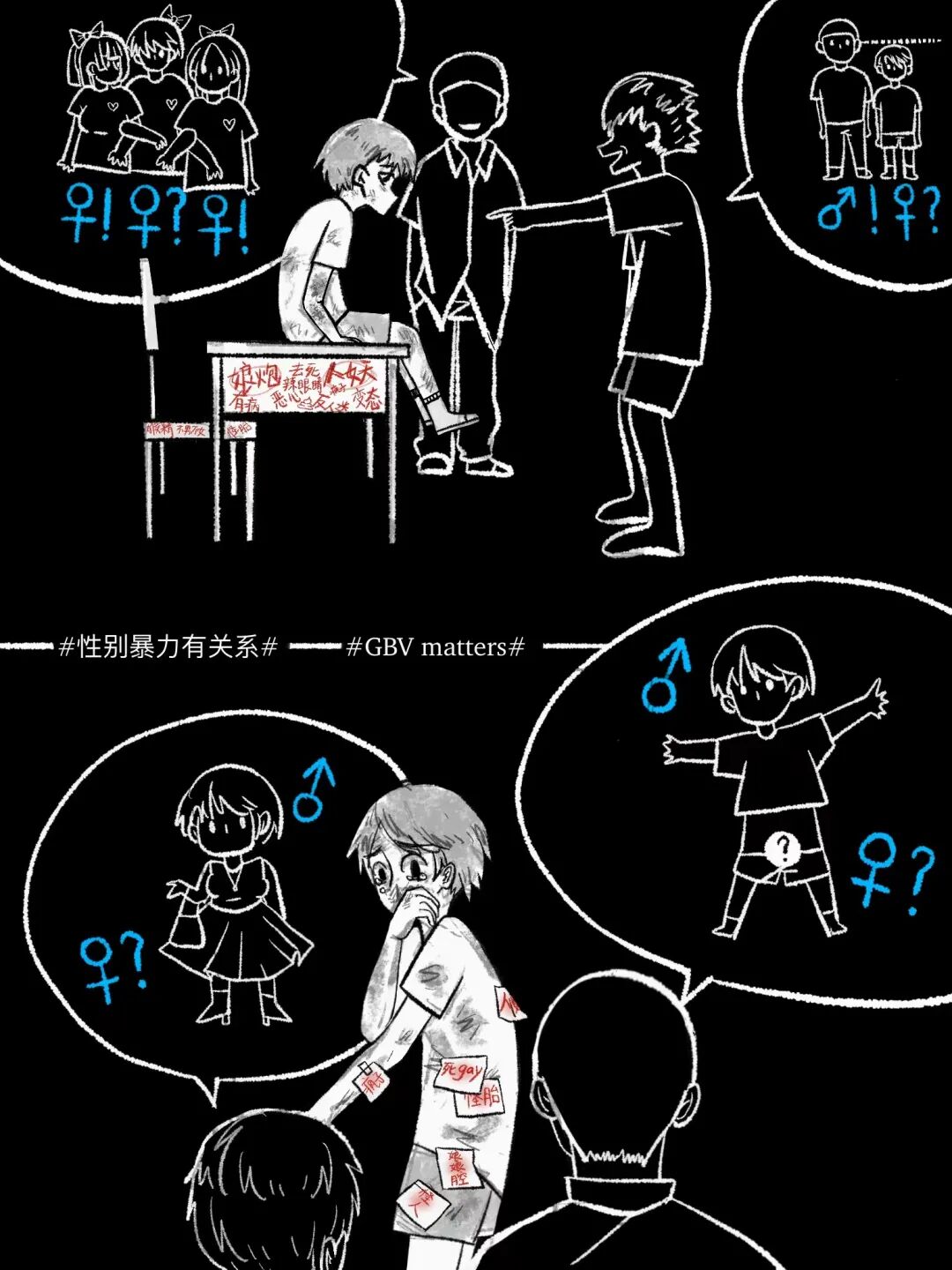 今天是反对性别暴力16日行动的最后一天,《不要再说没关系》系列漫画也已经更新完毕。从出生时的性别选择,到校园中的校园霸凌、职场中的就业歧视,再到人生终点的告别,多元性别群体面临的真实暴力困境难以用八张漫画完全展现。