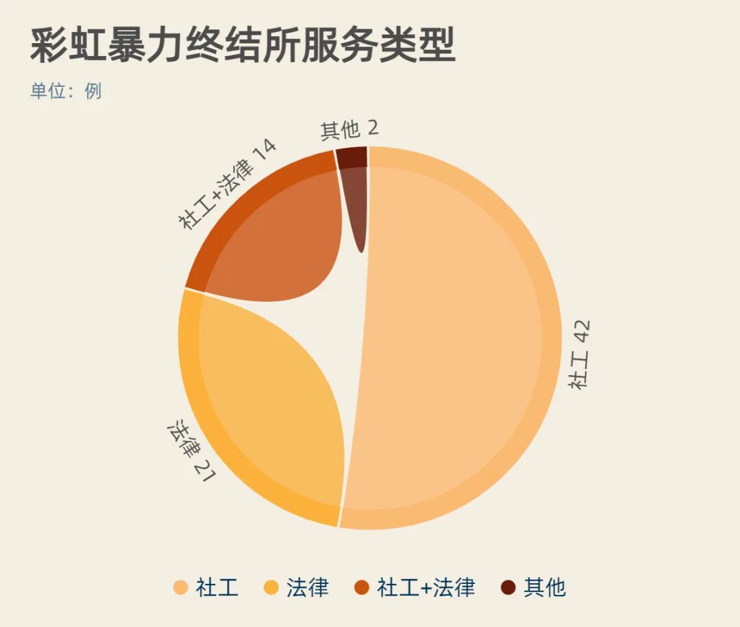 有42例案件属于社工服务,包括情绪疏导、暴力风险评估、安全计划制定、资源链接等等内容;而有21例案件属于法律服务,主要包括法律咨询和律师援助。另外还有14案件涉及到议题复杂,同时需要社工与法律在不同面向提供相应的服务(如图),因此在这些案件中,彩虹暴力终结所协调社工与法律两个专业背景的镇镇服务者展开联合服务。