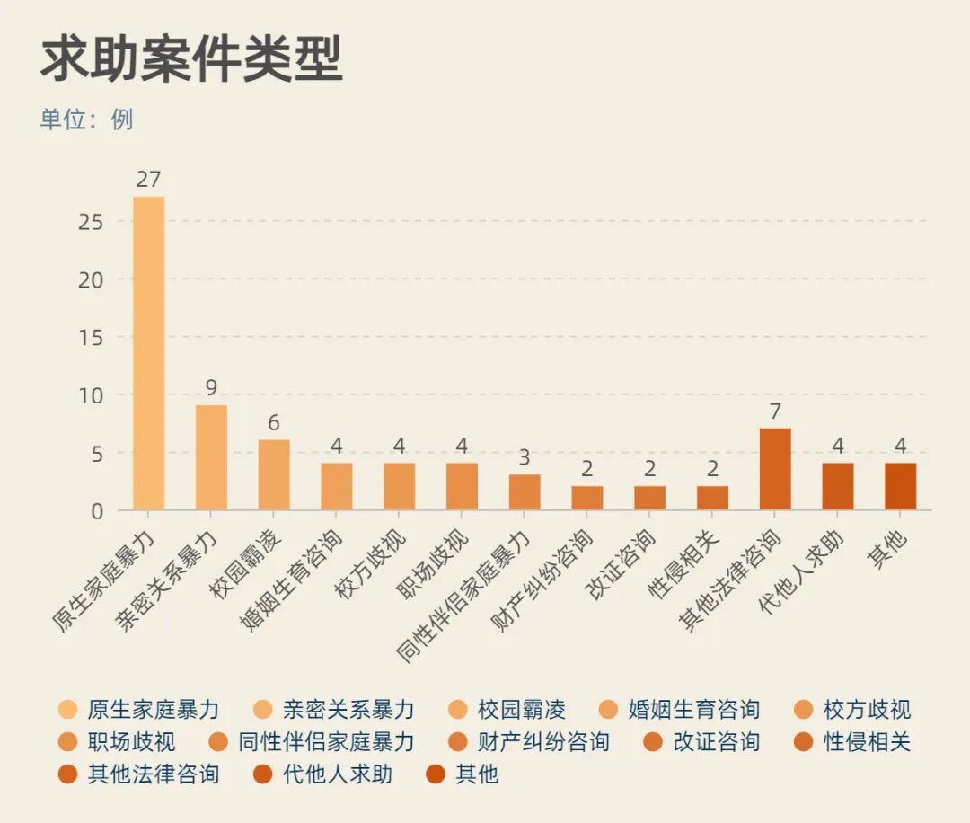 案件类型方面,有27例是遭遇了性倾向、性别认同、性别表达等“出柜”而引发的原生家庭暴力,而9例是性与性别少数群体遭遇了恋爱中或分手后的亲密关系暴力, 6例是遭遇了来自同学、老师等人的直接校园霸凌,4例来自校园制度层面校方歧视,4例遭遇就业或者工作环境中的就业歧视,3例是遭遇了来自同性伴侣父母的家庭暴力。