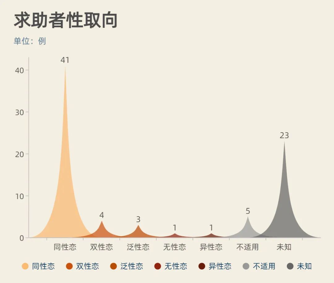 就求助者的性取向而言,同性恋41位、双性恋4位、泛性恋3位、无性恋1位、异性恋1位。性取向未知有23位,不适用5位(如图)。