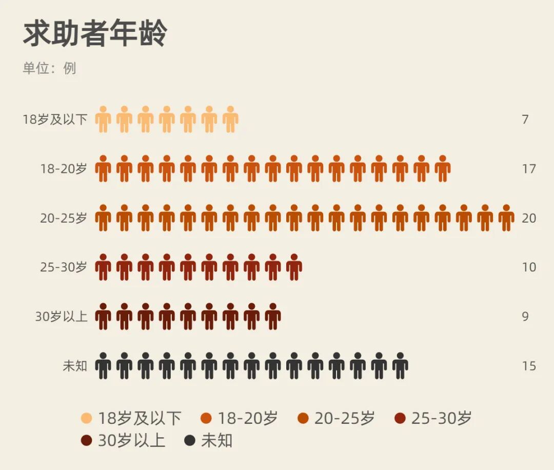 求助者年龄整体偏小,以青年人为主。最小15岁,最大41岁。18岁及以下的有7位求助者,其中未成年人2位。18-20岁的案主有17位,20-25岁的案主最多,共20位,而25-30岁以及20岁以上的案主分别有10和9位(如图)。