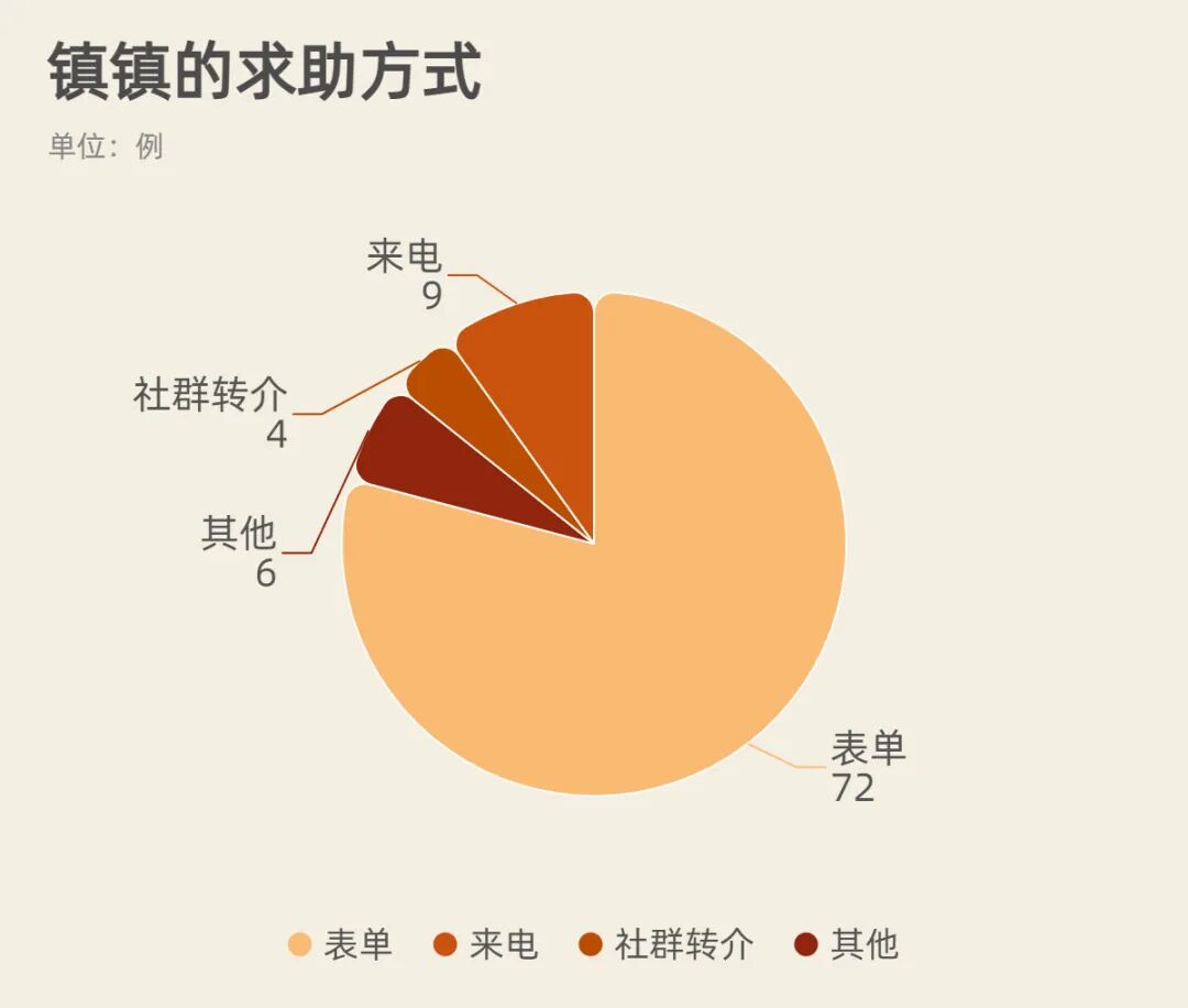 2021年,彩虹暴力终结所全年接到求助91例, 其中72例通过镇镇的求助表单求助,9例通过来电,4例通过社群转介找到镇镇(如图)。