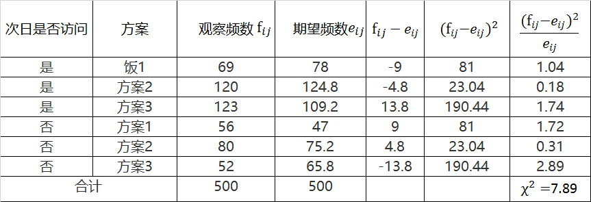 如果我们假定原假设为真,即所有总体的比例相等 ,那么就是每一组用户次日可能访问客户端比例的最佳估计值。因此如果为真,我们将期望方案 1 的 125 个用户会有0.624*125 = 78个用户次日会访问客户端,78 则是策略 1 的期望频数。
