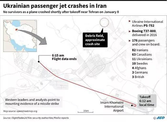 考虑到伊朗的安检还不至于像埃及那样松散漏洞百出,加上初期的坠毁现场照片,机身蒙皮已经有了一些向内侧翻卷的小破洞(后来发现,这些部位都是机身后部,因此还不太明显)。更需要考虑到伊朗弹道导弹反击美军基地之后的紧张局势——这个强烈而显著的背景,已经可以判断,伊朗防空力量误击民航客机的可能性,远远高于恰好被恐怖分子放置炸弹的可能——这需要时机上的多重巧合。![]()
