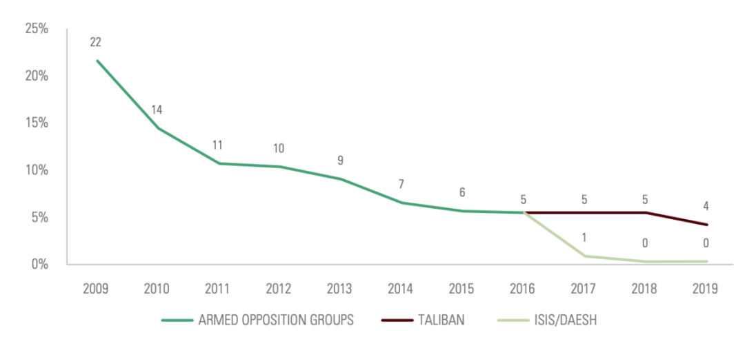2. 塔利班出现于1994年,在普什图语中意为学生。阿富汗战争和阿富汗内战期间,有数以百万计的难民逃往巴基斯坦并接受了伊斯兰原教旨主义教育。彼时塔利班领导人奥马尔曾依照当年接受的教育,主张恢复石刑等旧罚,禁止女性接受教育并炸毁巴米扬大佛。