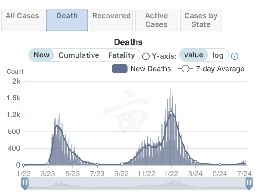 两国的相同之处,就是德尔塔高峰期都是45天至50 天;不同的是,病死人数一个冲高,一个只有微小的波动。1. 德尔塔变异株有独特的流行病特征,从快速递增到快递递减,45-50 天为一个周期。2. 人群可以通过感染获得自然免疫,但是代价太高(有学者认为印度可能已经有4百万人病逝)。3. 疫苗接种超过50%的总人口后,病死率明显下降。在英国,去年4月的时段病死率曾经在5%上下,甚至更高。但是,今年7月的时段病死率却只有0.1%左右,与严重流感相近。英国的高峰已经过去一周多了。美国刚开始出现复燃。可以预见的是,美国的病死率也会与英国相类似。因此,英美等西方发达国家,将会持续推进疫苗接种,逐渐开放的政策。他们的瓶颈是一部份民众(20-30%)抵制疫苗接种和许多民众反感戴口罩。![]()