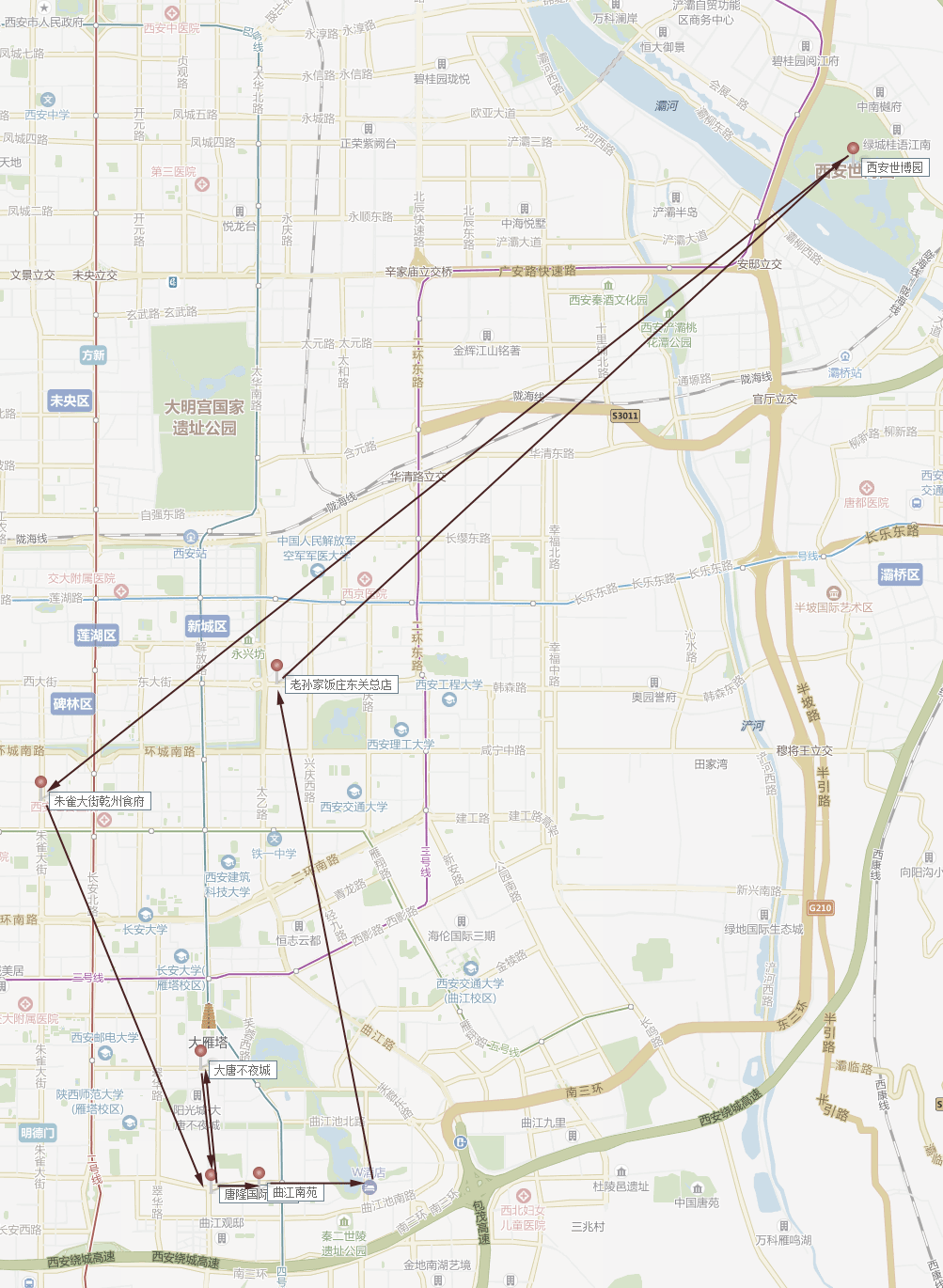16日周六病例1、2去八医院做核酸检测,游玩大雁塔;其余5人去朋友家做客,乘朋友私家车前往曲江池、西安世博园、大唐不夜城等地游玩。