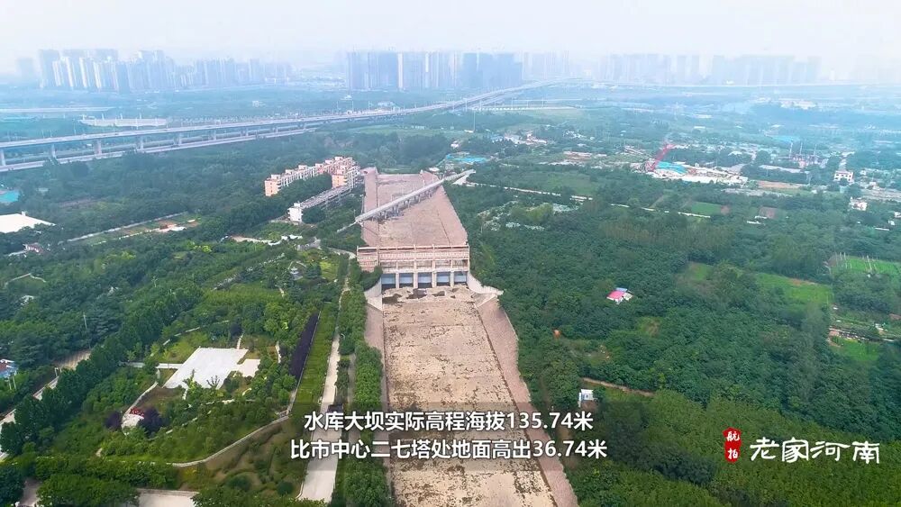 常庄水库大坝坝顶海拔高程135.74米,历史最高洪水位128.85米,警戒水位线127.49米,比市中心二七塔处的地面高程99米,高出近28.5米。