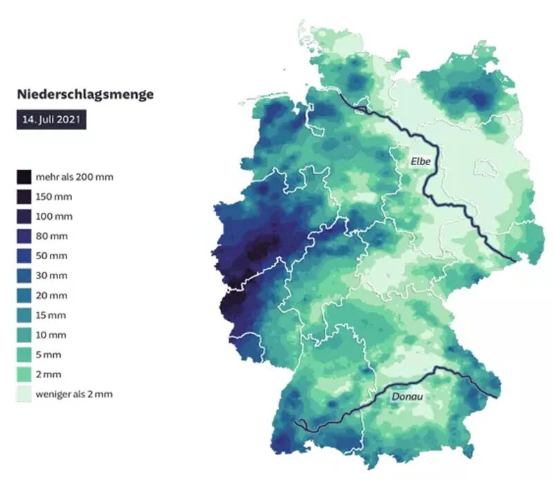但需注意,德国是温带海洋性气候,一年降雨量很均匀。154毫米几乎已经是当地7月平均降雨量的2倍。