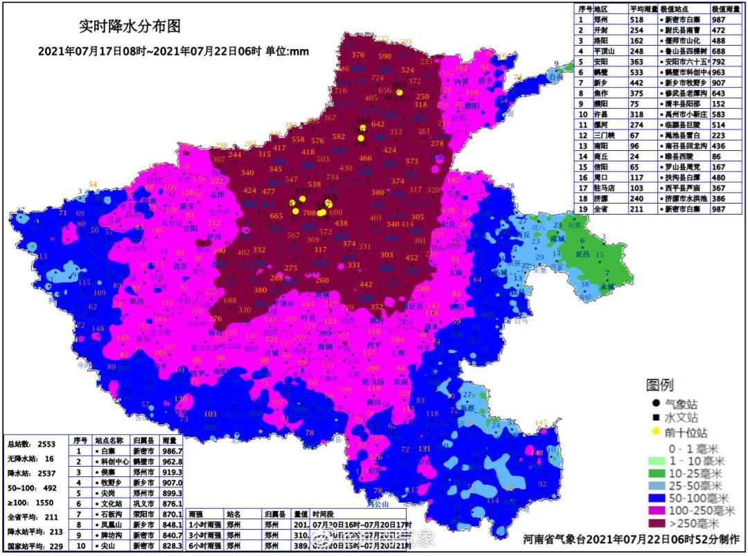 尖岗水库的水文气象站24小时降雨量达到了696.9毫米,近70厘米;12小时降雨量达到了543.6毫米,是郑州地区的降雨中心。