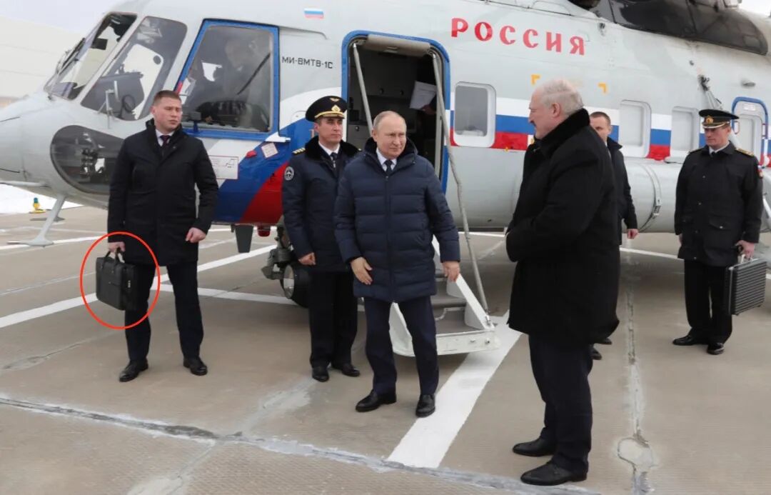 ▎普京会见白俄罗斯总统卢卡申科,随从官员(左一)携带着黑色公文包 图源:AP