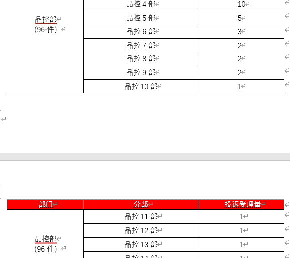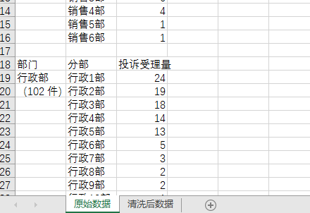 ❻ 数据清洗进行过半,我们再次删除第一列中的无用行。点击数据选项卡—选中「部门列」—选中带有「件」字关键词的行—选中全部—删除。取消筛选,这样的数据形式,是不是和最终数据有七八分像了呢?但是,数据中咋出现了重复部门呢?就连办件量都是一模一样。❼ 存在这样重复的数据,是 Word 中的手动拆分单元格造成的。![]()