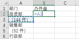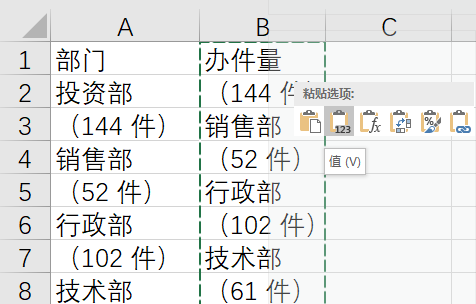 即当填充 B 列第 2 行的时候,我们在 B2 单元格中引入 A3 单元格的数值。下拉单元格即可填充整列,或使用快速填充功能,双击即可自动填充整列。选中填充好的办件量列,复制—单击【右键】—粘贴为【值】。如果不进行这个操作,最后的数据全部都会出现#REF 错误哦!因为在后续操作中,我们会把部门列中所有数字全部删除。