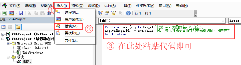 ❷ 插入代码,创建可以将目标值动态赋予特定单元格的自定义函数;