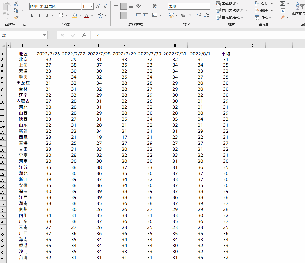 =AVERAGE(C3:I3)数据来源:中国天气网(取全国省会城市城区气温代表各省气温)