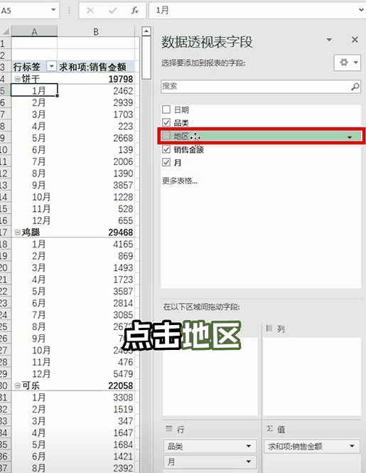 用鼠标选中【地区】,将它拖动到列区域中,搞定!