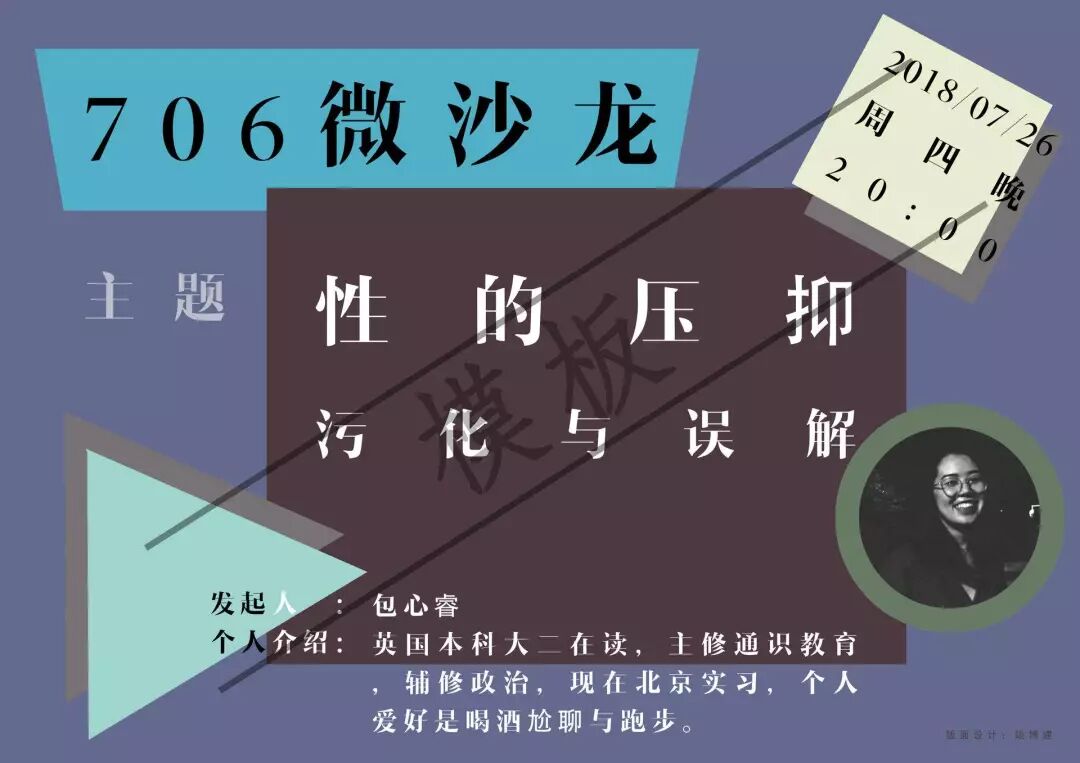想从自身经历出发,和大家聊聊国内的性文化。比如大家是如何看待性对一段关系的重要性、男女对性的幻想、性与权力的关系,以及对性可能有的误解。这场微沙龙的初衷是想把性去污化,增加对于性及两性关系的了解。毕竟生活中与朋友和家人还挺少聊这些内容,压抑和避而不谈,就可能产生误解。我希望能创造一个安全的空间,大家都能聊聊自己的经历、困惑和看法。希望706空间里的男女生都能踊跃参与,相信男女生之间会有相似的和不同的想法,也欢迎空间里的情侣们一起参加!