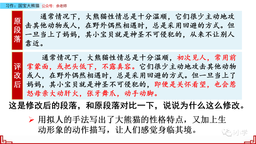 总评:小作者通过查找资料,在文章中向读者介绍了大熊猫的外形特点、生活习性和称为“国宝”的原因,让我们对大熊猫有了很多了解,加上细致的观察和生动的描写,读来饶有趣味。