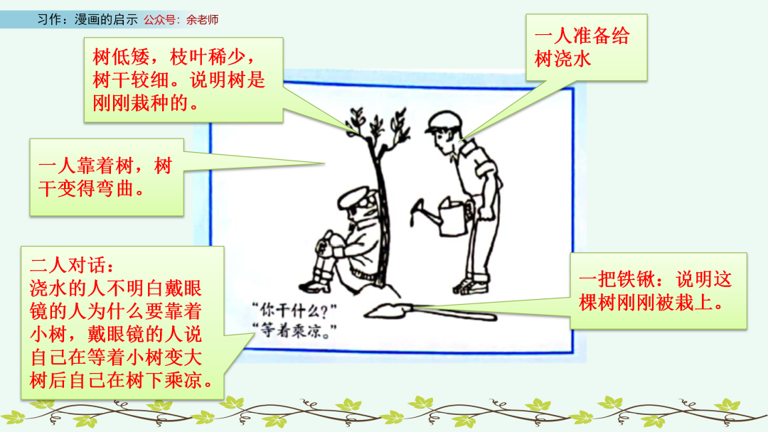 一个人正拿着水壶要给他刚刚栽好的小树浇水,却看到有一个人坐在小树下。于是,他问那个坐在小树下的人:“你干什么?”那个人回答说:“等着乘凉。”