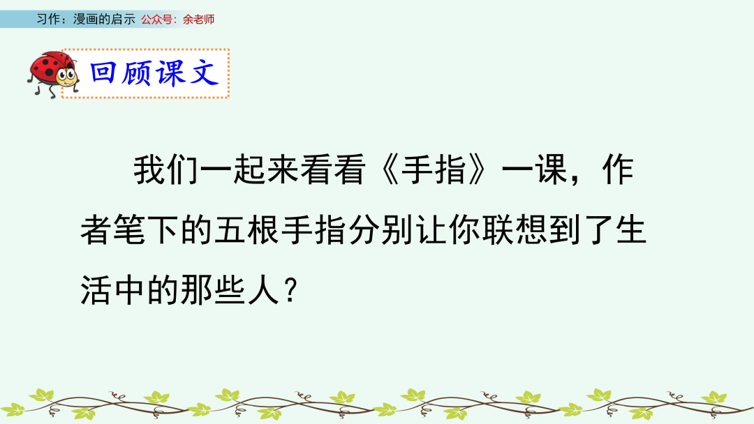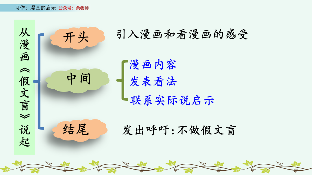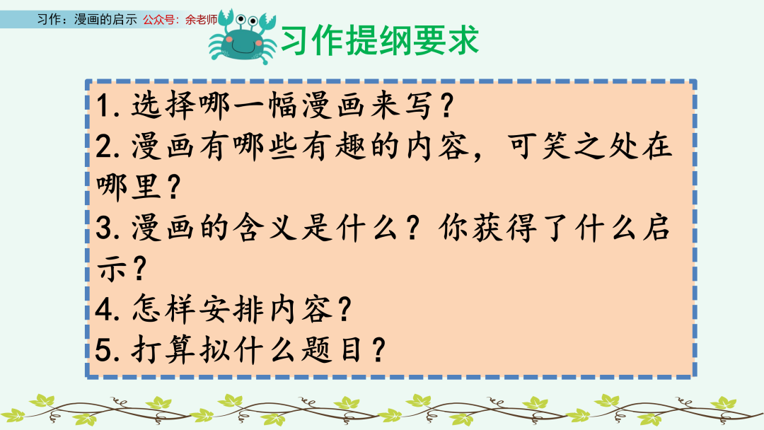 点评:小作者以设问开头,抓人眼球,引人深思。对漫画内容的概括简洁、明了,结合自己的事例谈启示,过渡自然。同时,文中呼吁大人放下手机,言辞恳切,感情真挚。