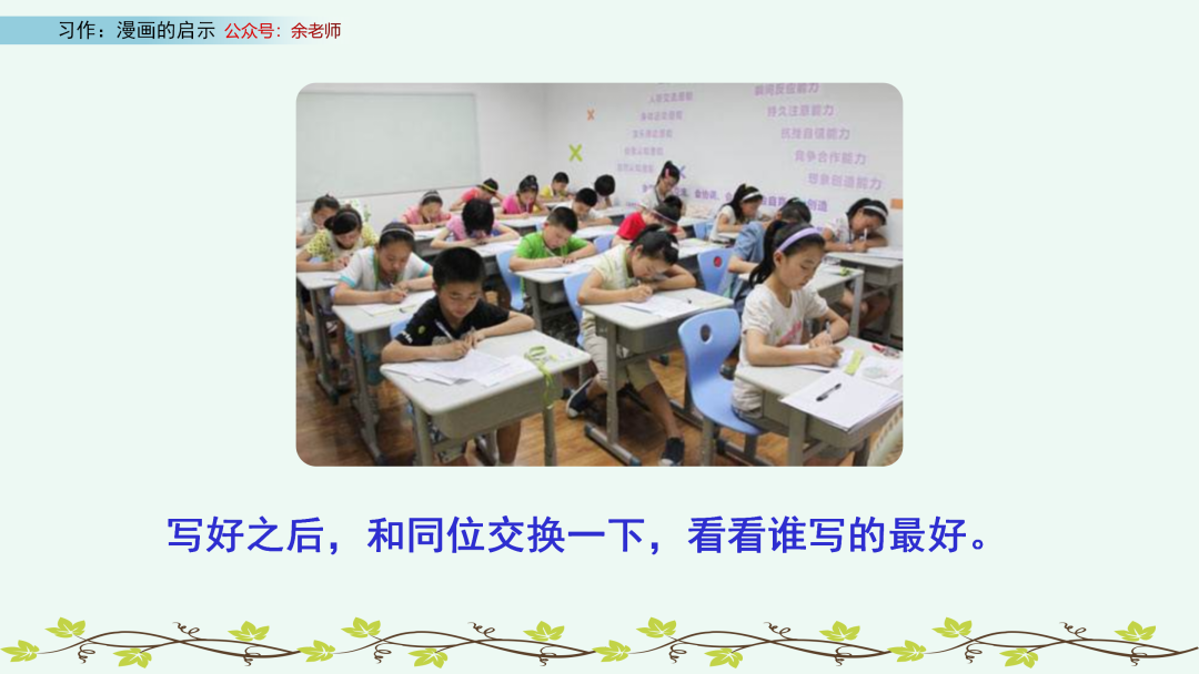 我看到这样一幅漫画:漫画中爷爷、爸爸、孙子三个人坐在一起吃饭,爸爸孝敬爷爷把鸡腿夹给了爷爷,爷爷爱护孙子把鸡腿又夹给了孙子,孙子尊敬爸爸又将鸡腿夹给了爸爸,三个人脸上都洋溢着幸福的笑容。漫画里没有标注人物之间的对话,但是我在他们让鸡腿的行为中看出他们三个人是相互关心、相互爱护的。