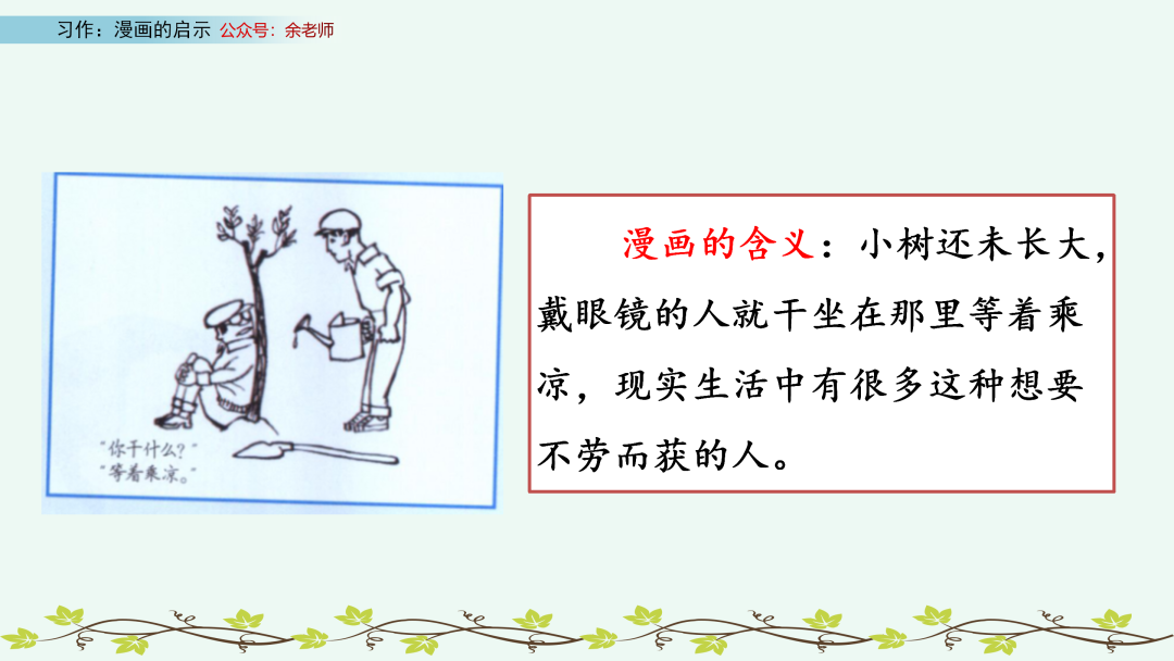 冰心的诗中写着:“成功的花,人们只惊羡它现时的明艳!然而当初她的芽儿,浸透了奋斗的泪泉,洒遍了牺牲的血雨。”想想那些在奥运会上为国争光的奥运健儿,他们哪个不是经过了千万次的艰苦训练,才取得令人惊羡的成绩?在生活和学习中,我们不能想着不劳而获、坐享其成,因为抱着这样的想法,我们就会变得像漫画中的那个等着乘凉的人一样可笑。