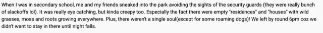 它位于新加坡西部,达曼裕廊一带,城门口是一个3米高的中国万里长城复制品。(图源:谷歌地图)唐城里的展品在当时的新加坡而言,是非常稀有的。有中国皇帝龙椅复制品、古代中国士兵仿制兵器等……(图源 :Lim Yao Ching 脸书)登上城门,唐城内的景象一览无余。(一座围绕着湖水以及拱桥所建造的小镇,图源:anniebees)这是一座斥资近一亿新币的中国文化主题公园。景区在1992年开业后,吸引了许多游客前往。走入城内,仿如回到公元600多年。唐城的设计独特、富于中华文化和历史韵味,可感受唐朝盛世的社稷氛围。园中有繁荣发达的唐街景象。(连工作人员的着装、打扮都推回1500年前,图源:Riley)就像现在许多的主题公园一样,城中充斥着各种表演,让人身临其境。(图源:Tang Dynasty Village Singapore)还有各种在古装剧里才能看到的场景。(图源:Tang Dynasty Village Singapore)除此之外,城中还展出了各种历史复制品,如西安的兵马俑。(图源:anniebees)还有雕刻品、古代的龙椅以及仿制的各种兵器等等。(图源:anniebees)唐城也是一座影视城,为新加坡的电视剧提供拍摄场景。(图源:State of buildings)这座斥巨资的主题公园每年预计吸引90万游客,利润可达2000万新币,被广大投资者给予厚望。营业初期,唐城的确吸引了许多游客到访。但不幸的是,1997年的亚洲金融危机影响了市场消费。由于门票价格高,景区也一直没有增添新的景点,游客逐年减少,主题公园的收入一年不如一年。1999年,唐城宣布停止营业。(图源:anniebees)停业后,唐城也渐渐淡出了新加坡人的视野。城中的建筑逐渐长满了蔓生的青苔,各处都是倒塌的雕像。(图源:lomography)这座昔日热闹非凡的主题公园,一度成了新加坡人心目中的“鬼城”,不禁令人感到唏嘘。(图源:lomography)在荒废了近10年后,唐城最终于2008年1月被拆除。(图源:Singapore Memory Project)如今已完全看不出,这块草地过去曾竖立着一座繁华的唐城。(图源:Singapore Memory Project)创始人在一段采访中透露,唐城倒闭后,由于负债6200万新币,唐城内的所有展览品都被拿去拍卖。城中的音响、灯光设备等也通通以低于成本的价格卖给了影视制作公司。当被问及是否后悔创建这个项目时,创始人说:“莫以成败论英雄,一辈子,能为自己的理想奋不顾身地赌一把,就比绝大多数的平凡人伟大了,不是吗?”(图源:Riley)从一部关于唐城的影片的讨论区中,部分新加坡人的记忆中似乎还有这么一座城市。网友表示,他在中学时期会与朋友一起溜进唐城中。当时城中已经长满了杂草,没有任何一个人。摘用网友的话:“昔日唐城,今日荒地,已成追忆。”(图源:State of Buildings)(图源:Tay Phuay Hwee 脸书)