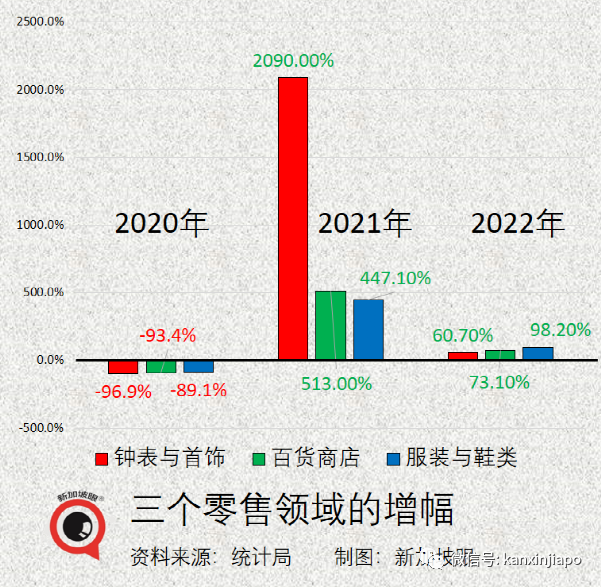 以金额计算,五月份零售总额为39亿新元,包括13.6%网购零售额。回想起两年前的四月,为了压制疫情实施代号为“断路器”的限制措施,零售业一片哀鸿遍野,2020年5月份零售额暴跌52.1%,尤其钟表与首饰、百货商店、服装与鞋类,为跌幅最大的三项。一年后,到了2021年五月份,钟表与首饰零售反弹2090%,百货商店零售反弹513%,服装与鞋类零售反弹447.10%。又一年后,今年五月份,此三个领域增幅最高。在去年的基础上,钟表与首饰零售继续上涨60.7%,百货商店零售继续上涨73.1%,服装与鞋类零售继续上涨98.2%。相对起两年前的惨状,现在缓过劲来了。回想起两年前那种萧条、死寂,实在令人感到绝望与无助。零售销售指数今年之所以连续三个月上涨,主要有两个因素:一个是新加坡进一步放宽冠病防疫措施,另一个是开放边境,刺激了整体消费和旅游消费。至于五月份猛涨17.8%,另一个主要原因是去年同期执行冠病管制措施,堂食以二人为限,餐饮消费受到压制。今年3月29日,新加坡放宽堂食限制,从5人放宽至10人;到了4月26日,全面开放堂食,对聚餐人数再无限制。进入五月份之后,餐饮零售同比暴增。三月份餐饮销售增长4.6%;四月份增长11.4%;五月份暴增40.1%,零售额达到9亿1000万新元。经季节性调整,环比增长为7.9%。