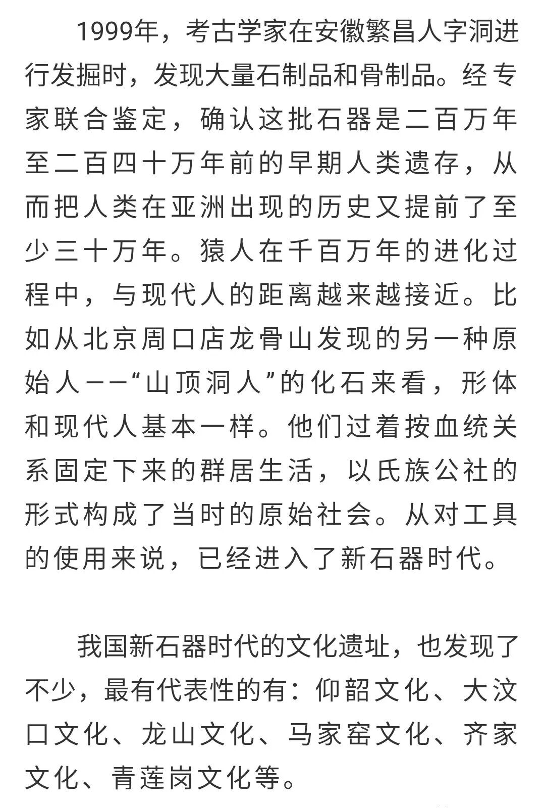 大约在二百多万年以前,在我们祖国广大的土地上,就有远古的人类在活动。云南元谋、陕西蓝田、北京周口店、重庆巫山、安徽繁昌等地区,都发现了我国最早的原始人类的遗骸和遗物。1927年,中国发现“北京猿人”化石,距今已有四五十万年的历史。之后,相继发现了“北京猿人”制作和使用的工具以及用火遗迹。而陕西出土的“蓝田猿人”,距今已有八十万年的历史。从二十世纪五十年代起,云南陆续发现了许多古猿化石,而且伴有石器,其中最有代表性的,是八十年代发现的“元谋猿人”,距今已有一百七十万年历史。1997年,考古学家在重庆市巫山县庙宇镇龙骨坡“巫山猿人”遗址进行挖掘考察时,发现了大量旧石器,都带有人工打击的痕迹,是古人类所使用的工具。这一结果,有力地证实了二百万年前“巫山猿人”的存在。