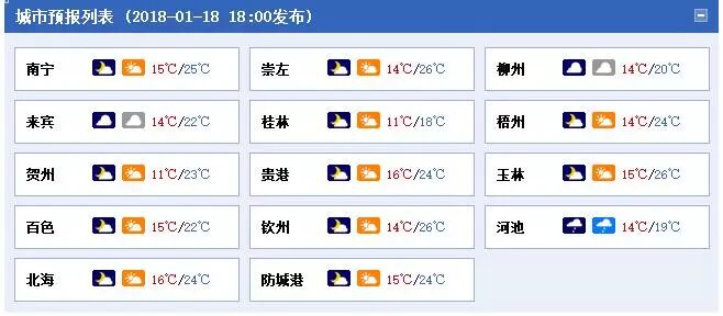 南宁市:今天,多云,偏东风1~2级,最低气温15℃,最高气温25℃。