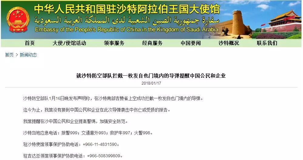1月18日,据中国驻沙特阿拉伯王国大使馆网站消息,当地时间1月16日晚,沙特防空部队成功拦截一枚发自也门的导弹。目前尚无中国公民伤亡。对此,中国驻沙特大使馆提醒中国公民提高警惕。