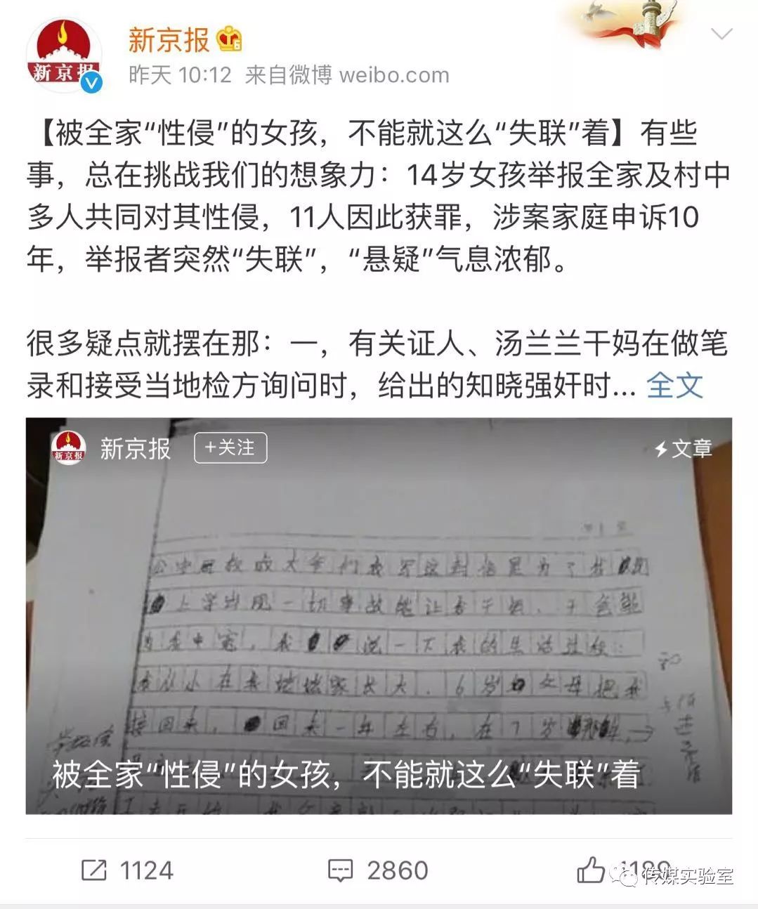 此后,新京报发表《被全家“性侵”的女孩汤兰兰,不能就这么“失联”着》评论。
