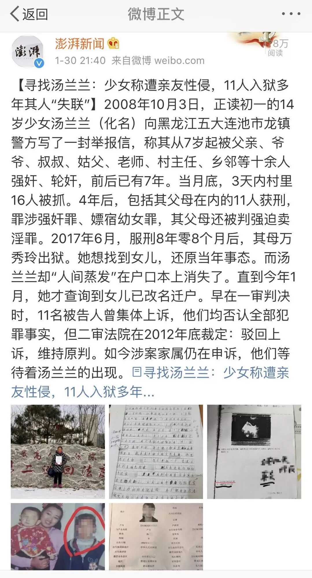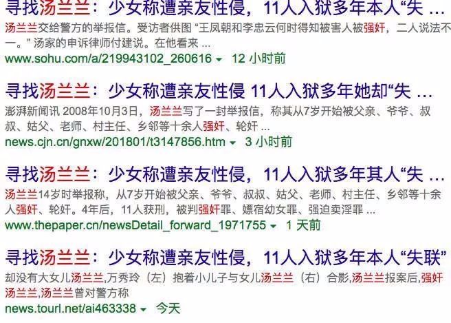 1月30日,澎湃新闻撰写的《寻找汤兰兰:少女称遭亲友性侵,11人入狱多年其人“失联”》引起轰动。这篇文章将问题指向当年被家人性侵的幼女汤兰兰,并曝出受害人的户口信息。