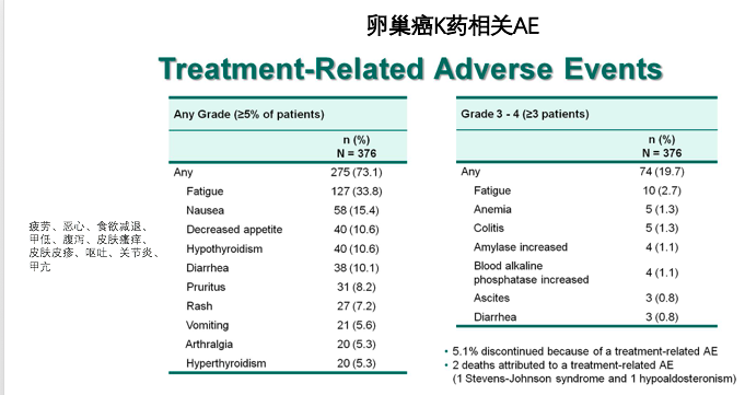 免疫相关性肺炎是危及生命的严重的不良反应。一般发生在治疗后的2-3个月,处理起来要比肠炎更积极一些。卵巢癌患者都是女性,很少有吸烟病史,有肺部基础疾病(COPD、肺纤维化)比肺癌病人要少,所以免疫相关性肺炎的发病率不高,但是不代表没有。由于免疫相关性肺炎来势汹汹,进展很快,所以患者和医生还是要迅速诊断,及时停药,以免错过最佳治疗时机。