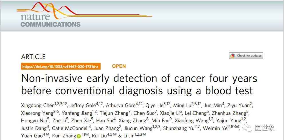实际上,2020年7月,复旦大学泰州健康科学研究院团队利用鹍远生物自主研发的循环肿瘤DNA(ctDNA)甲基化泛癌筛查技术PanSeer®,首次实现泛癌早筛技术在大型自然人群队列中的应用,相关研究成果刊发于国际权威学术期刊《自然通讯》上。研究发现:应用ctDNA甲基化标志物,实现了提前4年“预警”肺癌、胃癌、食管癌、肝癌和直肠癌等5种常见恶性肿瘤,灵敏度95%,特异性96%。