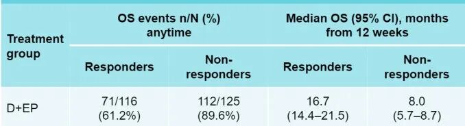 研究结果显示,在12周时仍存活的患者中,与EP组相比,D+EP组的应答者比例高于EP组(图1)。